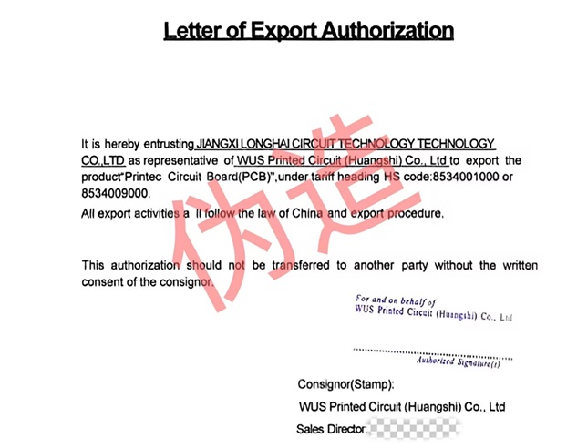 近日,本集團子公司黃石滬士電子有限公司(以下稱“本公司”)接到印度合作方反映,有不法分子偽造本公司出口授權(quán)書及印章(見附件)、非法盜用本公司名稱,以“委托江西隆海電路科技有限公司代理出口”為名實施商業(yè)欺詐,使廣大客戶及行業(yè)同仁產(chǎn)生混淆和誤解。對此,本公司嚴正聲明如下: